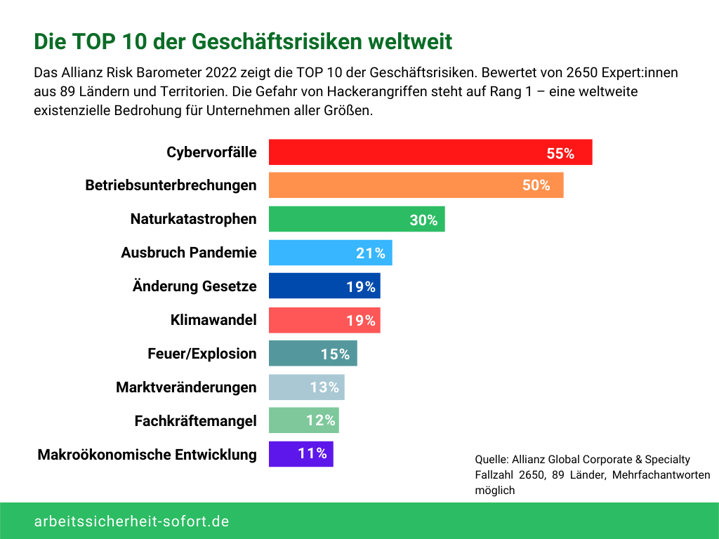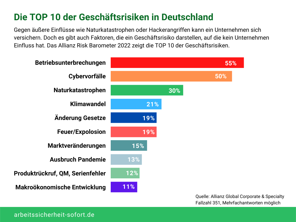 Zahlreiche Unternehmen sind ständig mit einer Vielzahl von wirtschaftlichen Gefahren konfrontiert. Zum zehnten Mal in Folge wurde das Allianz Risikobarometer veröffentlicht. Im Rahmen einer Analyse wurden Expert:innen zu den größten Risiken und Bedrohungen im Unternehmensbereich befragt. Die Belastung durch die weltweite Pandemie, die ständigen Änderungen der gesetzlichen Anforderungen und der Fachkräftemangel machen eine langfristige Planung für Unternehmen extrem schwierig.