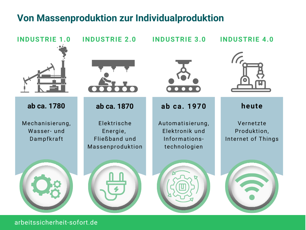 Die erste industrielle Revolution war ungefähr 1780, begann in England und schwappte im 19. Jahrhundert auch auf andere europäische Länder um. In dieser Zeit startete die erste Massenproduktion durch Maschinen. Diese wurden durch Wasser- und Dampfkraft betrieben. Bedeutende Erfindungen zu dieser Zeit waren der mechanische Webstuhl, die Dampfmaschine und Eisenbahn. Mit der Industrie 1.0 wurden traditionelle Arbeitsformen wie die Manufaktur oder das Handwerk durch Maschinen ersetzt.