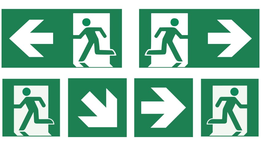 Auch die Rettungszeichen haben eine wichtige Funktion in Notfällen. Im Gegensatz zu den Brandschutzzeichen tragen sie jedoch die Signalfarbe Grün und haben eine weiße Schriftfarbe. Sie kennzeichnen ebenso Gegenstände, die zur Hilfe genommen werden können. Außerdem markieren sie Rettungswege, Notausgänge sowie Erste-Hilfe-Einrichtungen. Das Rettungszeichen für Notausgänge ist euch wahrscheinlich schon bekannt. Es zeigt eine Person, die sich entweder nach rechts oder nach links in Richtung einer Tür bewegt. Bei diesen richtungsweisenden Zeichen ist zusätzlich ein Pfeilzeichen notwendig.