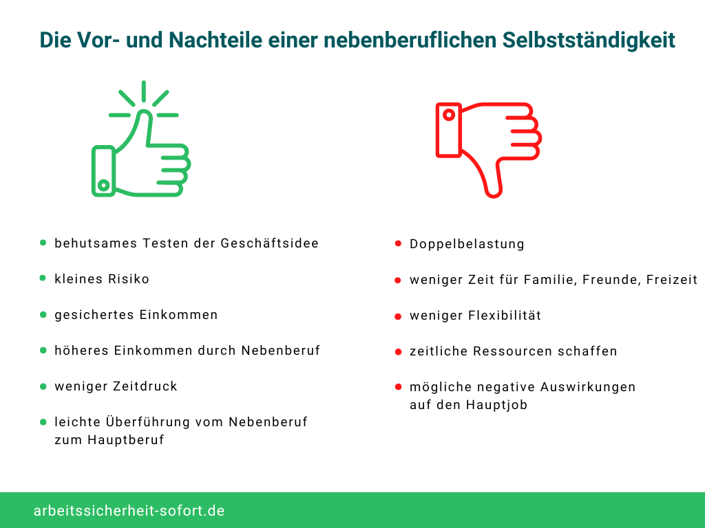 Wer neben seiner Selbstständigkeit zusätzlich fest angestellt ist, behält sein sicheres Standbein und eine Einnahmequelle, auf die er immer zurückgreifen kann. Wer sich selbstständig macht, hat zudem vorerst keine Mitarbeitenden, die er bezahlen muss. Es besteht also die Möglichkeit, erst einmal zu schauen, ob die selbstständige Tätigkeit das Richtige für einen ist und ob es einen Markt für das jeweilige Angebot gibt.